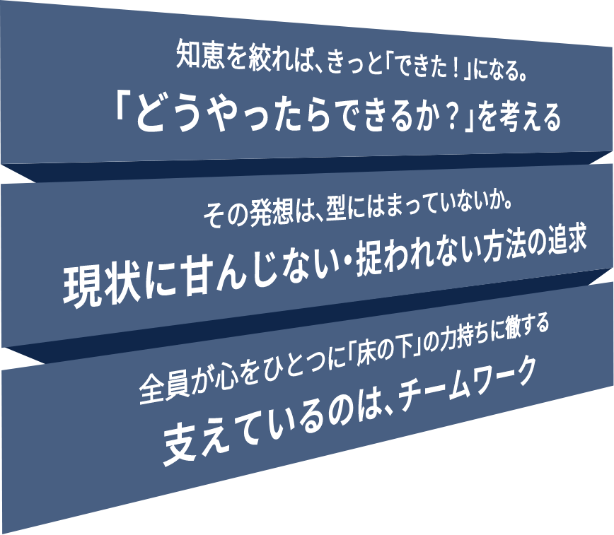 この理念を胸に、環境に合わせた商品を開発して事業成長をめざしています。『できる!からの発想』を心根に、創造的集団として新分野にも挑戦し、進化・前進していきます。そして、会社とその社員の繁栄発展ために収益を求めます。
